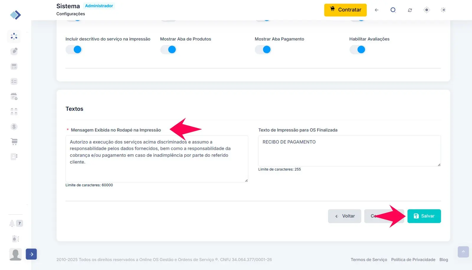 2 – Na aba Ordens de Serviço | Orçamentos, role a página até o final, altere o texto no campo “Mensagem Exibida no Rodapé da Impressão” e clique em Salvar.