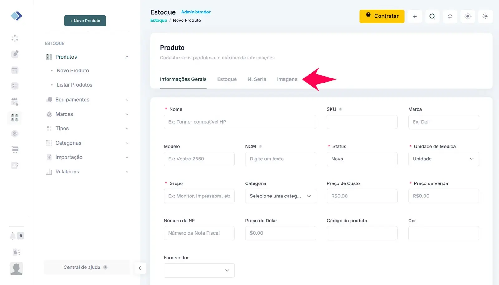 3 – Nas abas Informações Gerais, Estoque, Nº de Série e Imagens (caso seu plano permita), preencha o máximo de informações sobre o produto. Ao finalizar, clique em Salvar para concluir o cadastro.