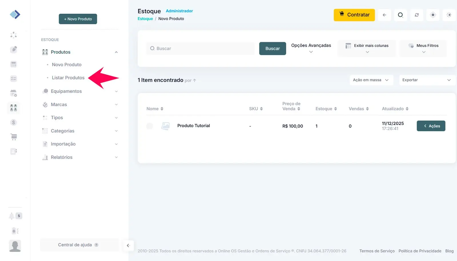 4 – Após cadastrar, volte ao menu Estoque, clique em Produtos e depois em Listar Produtos. Todos os produtos cadastrados serão exibidos, permitindo edição ou exclusão quando necessário.