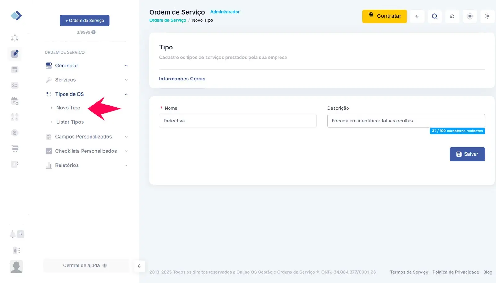 Como cadastrar um novo tipo para sua Ordem de Serviço?