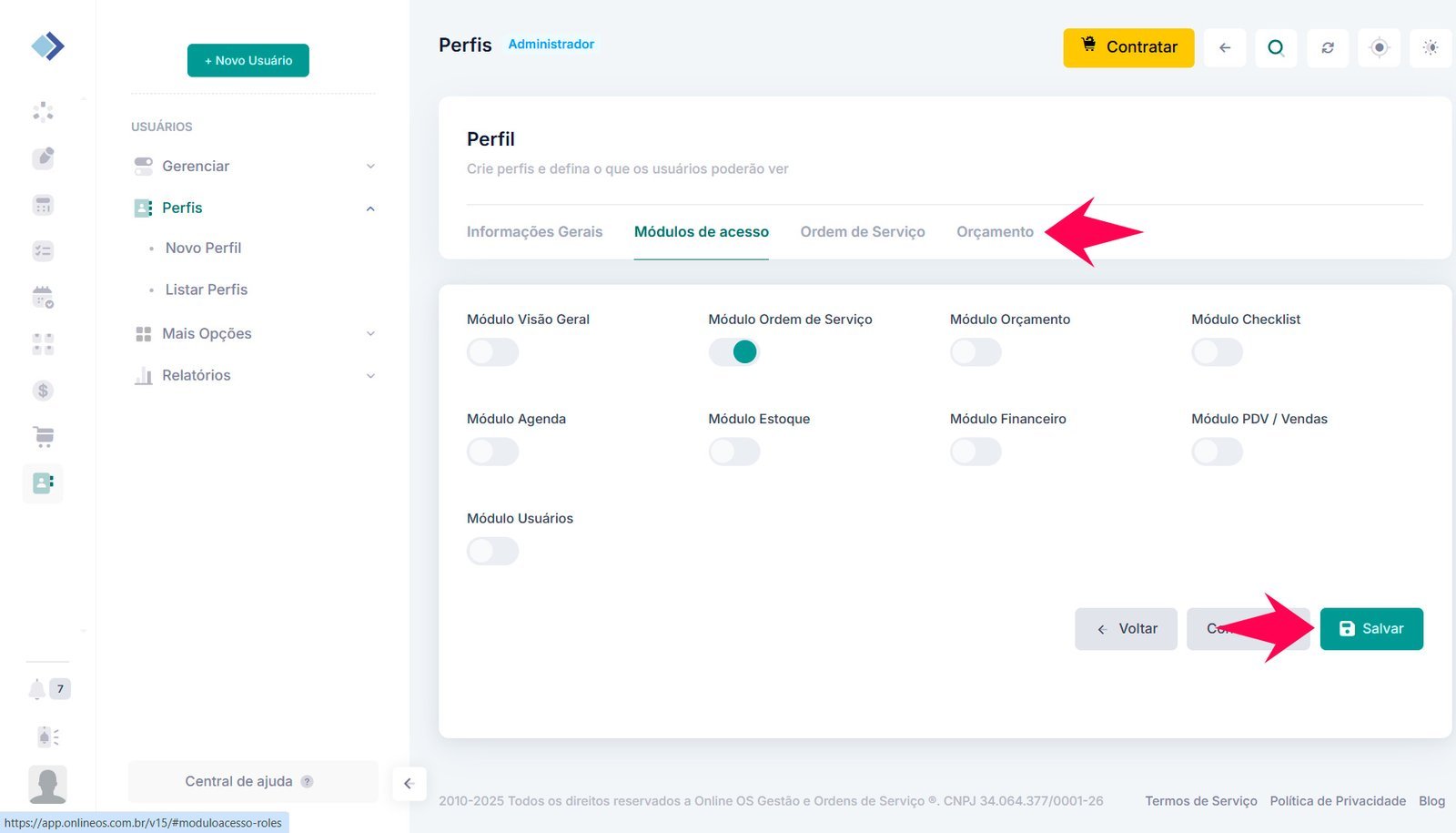 3 – Nas abas disponíveis, habilite os módulos e permissões que o perfil poderá utilizar e clique em Salvar. Assim que os usuários vinculados a esse perfil encerrarem a sessão e acessarem novamente, as novas configurações serão aplicadas.