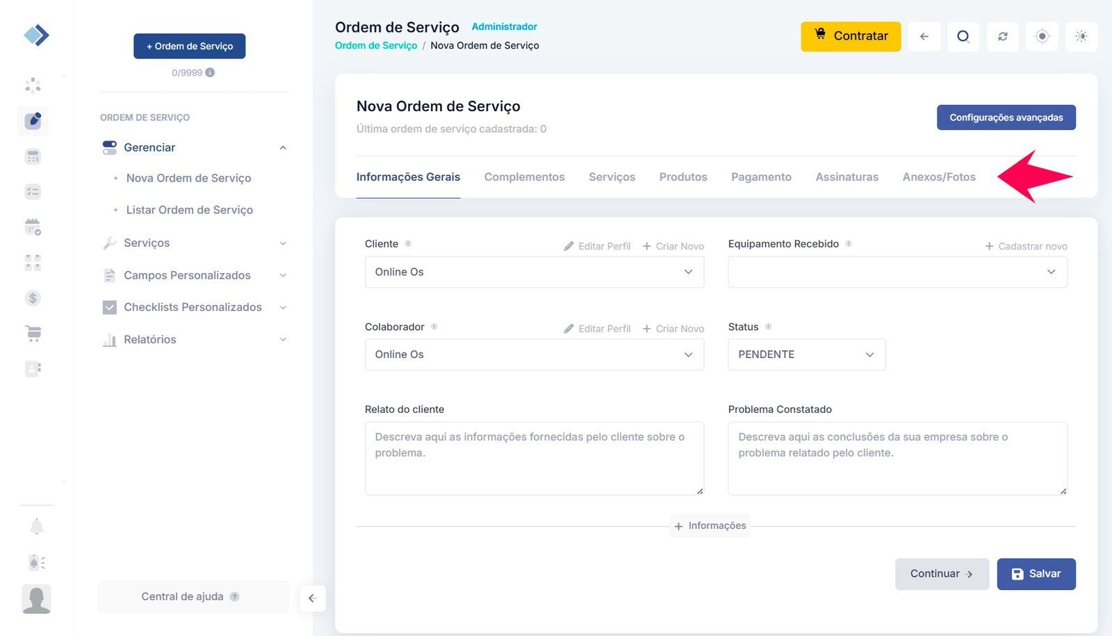 3 – Preencha as informações principais, como cliente, colaborador responsável e equipamento recebido. Navegue pelas abas e adicione o máximo de detalhes possível, incluindo Serviço realizado, Produtos utilizados, além de imagens e arquivos (caso seu plano permita).