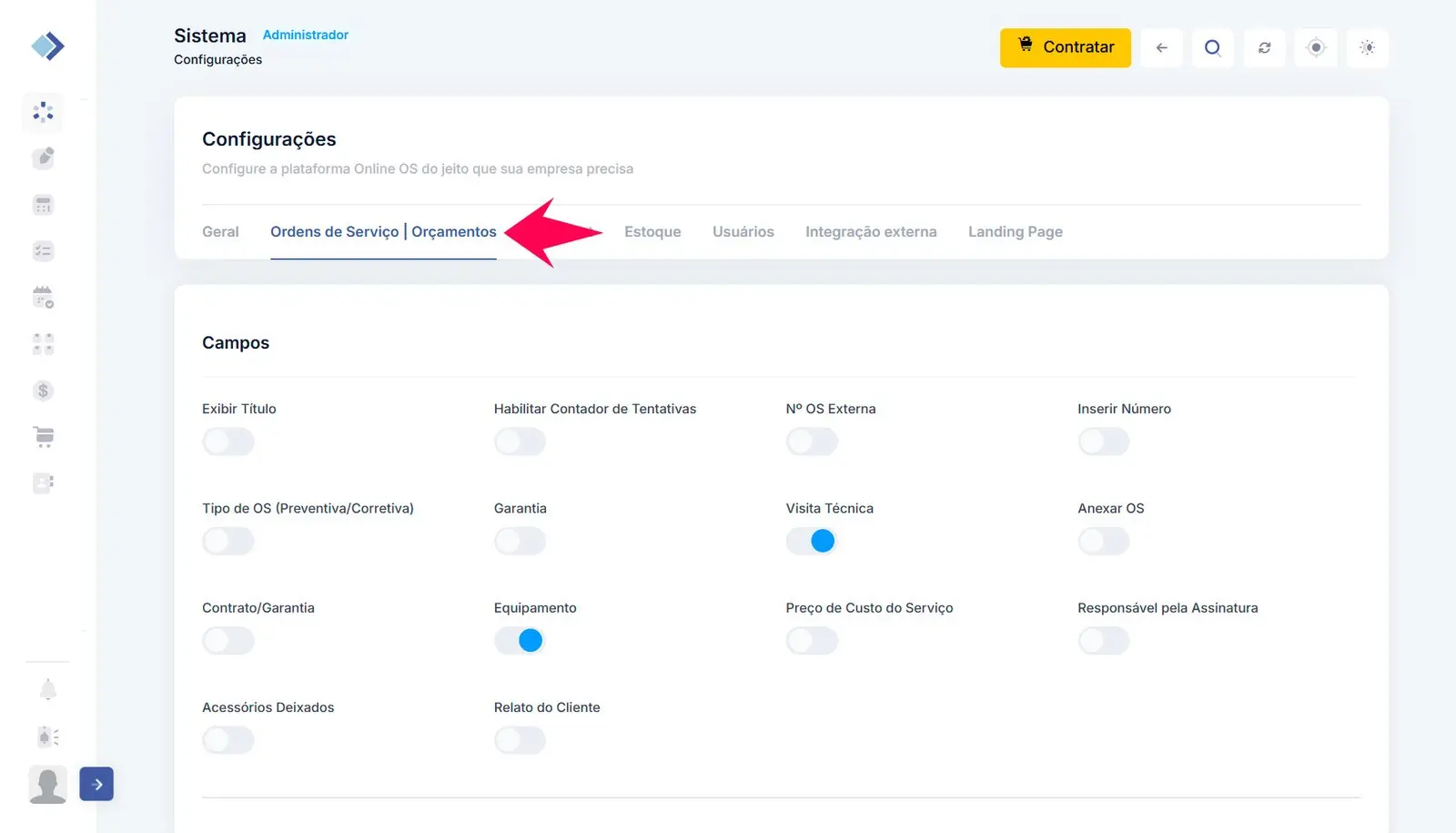 Para habilitar ou desabilitar campos e funcionalidades nas Ordens de Serviço, siga estes passos: