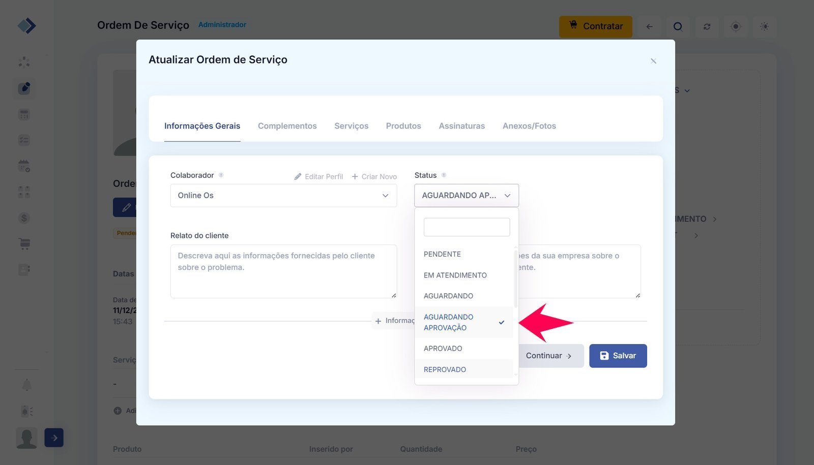 1 – Vá em editar a ordem de serviço, e ao abrir o formulário, vá até ao campo Status e selecione a opção Aguardando Aprovação, e clique em Salvar:
