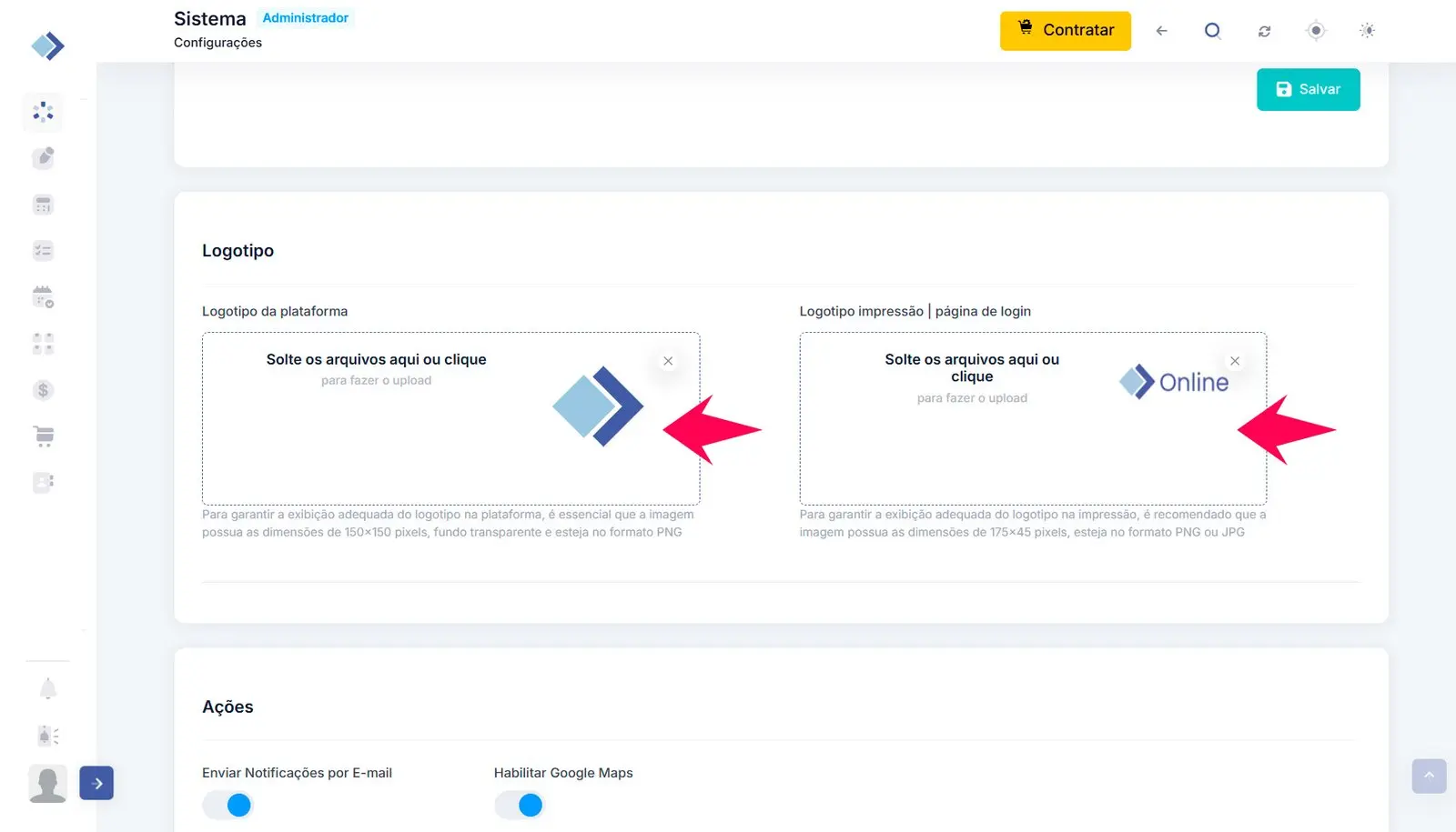 3 – Observe os formatos e tamanhos de imagem permitidos. Após enviar o arquivo, o logotipo será atualizado automaticamente.