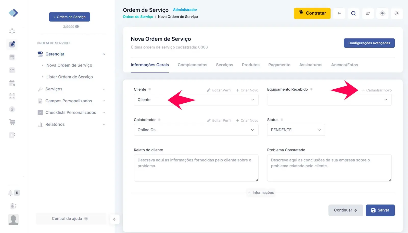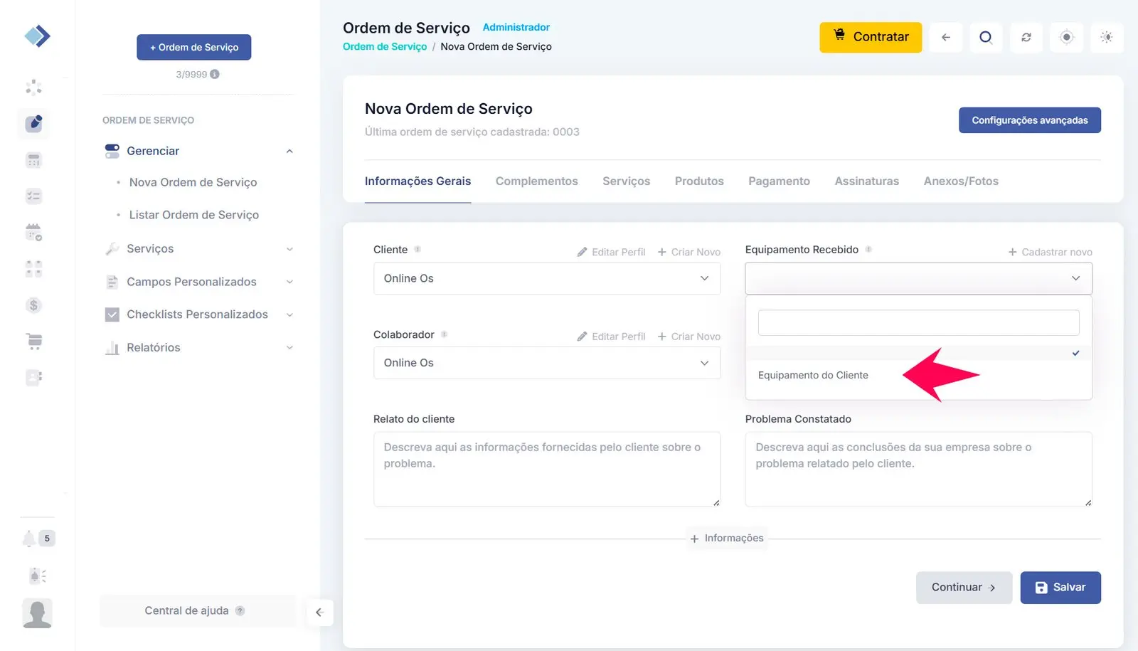3 – Durante o cadastro da ordem de serviço, selecione um Cliente já cadastrado ou cadastre um novo. No campo Equipamento, clique em + Cadastro Novo.