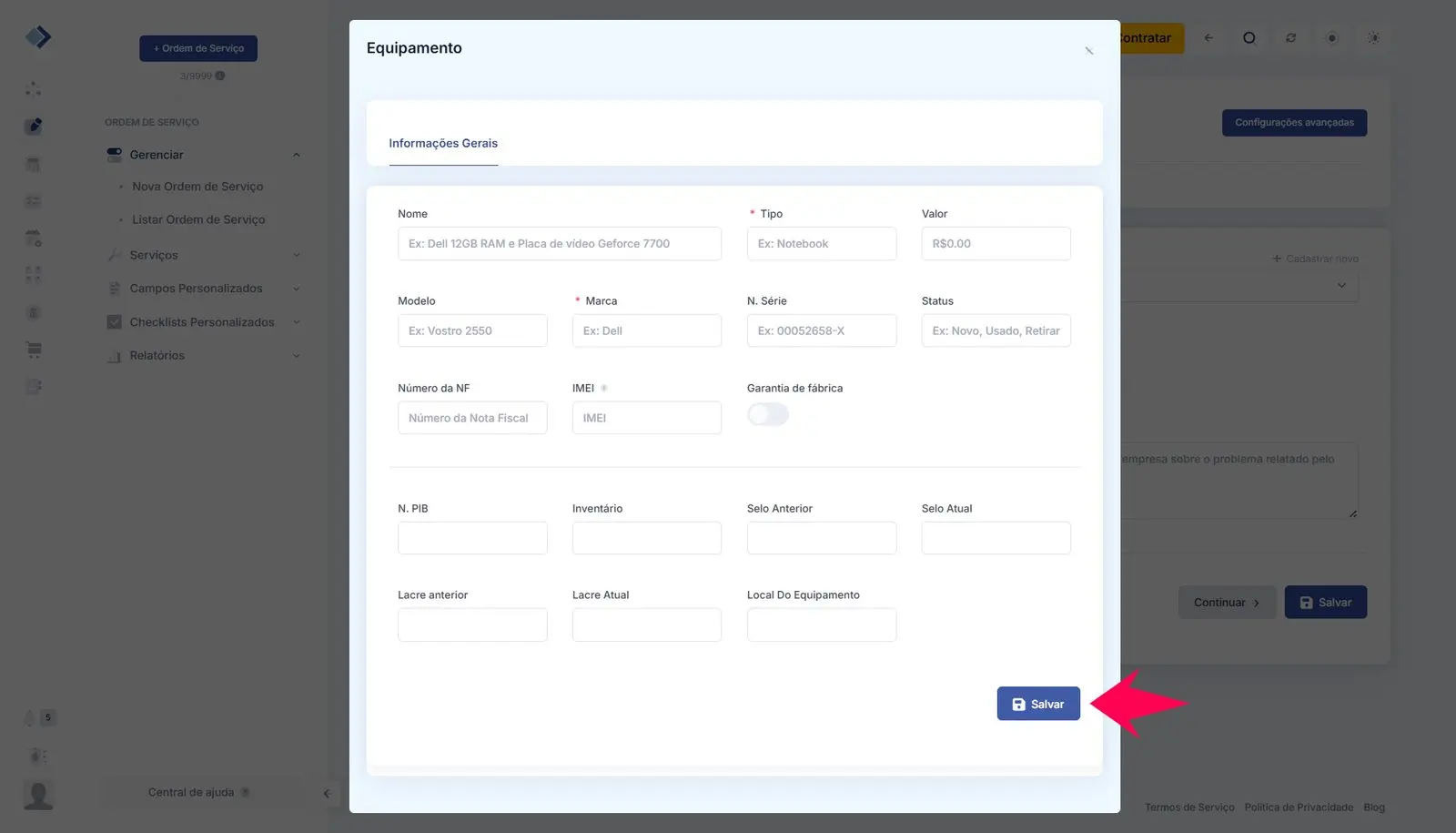 4 – Preencha o cadastro do equipamento com o máximo de informações possível e clique em Salvar.